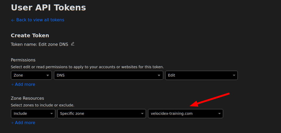 Edit Zone DNS in the API Token templates.You will require the “Edit” permission on Zone DNS and include the specific zone name you want to manage. The zone name is the domain you purchased for example “example.com”. You will be able to set the hostname under that domain, e.g. “velociraptor.example.com”