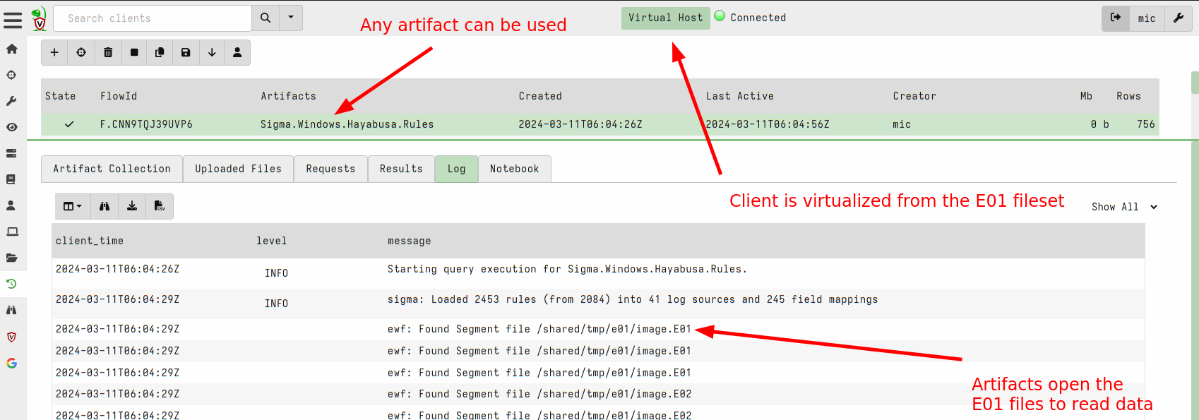 Next we launch a client with the remapping file. This causes any VQL queries that access the filesystem to come from the image instead of the host. Other than that the client looks like a regular client and will connect to the Velociraptor server just like any other client. To ensure that this client is unique you can override the writeback location (where the client id is stored) to a new file.