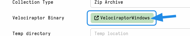 The option you choose will change the Velociraptor Binary tool button on the collector options form. Normally you don’t need to do anything with this field, but it helps to understand what it means: The target binary that will be used is defined as a Velociraptor tool and the server will attempt to download it from GitHub. If your server has no internet access then this obviously won’t work, so in that case you’ll need to manually upload the binary.