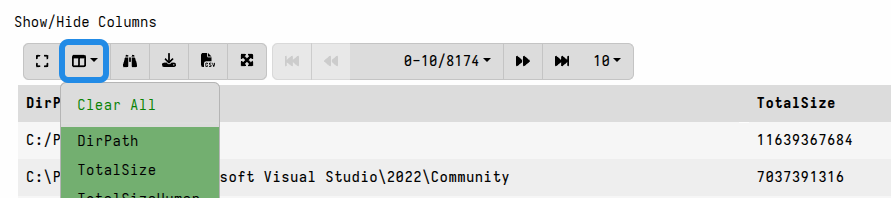 All Velociraptor tables have a common set of tools available, which are available in a common table toolbar that you’ll see whenever tabular results are presented in the GUI.